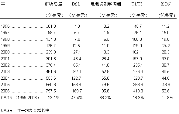 根據(jù) Frost & Sullivan 的預(yù)測(cè), 從1999年到2006年,美國(guó)寬帶接入服務(wù)市場(chǎng)的年平均復(fù)合增長(zhǎng)率為23.1%。預(yù)計(jì)在2006年, 美國(guó)寬帶接入服務(wù)的市場(chǎng)總額將高達(dá)757.5億美元。 其中DSL接入服務(wù)的增長(zhǎng)幅度最大,年平均復(fù)合增長(zhǎng)率高達(dá)47.4%,而DSL市場(chǎng)總額將增長(zhǎng)為189.7億美元,占整個(gè)市場(chǎng)的26.2%。 電纜調(diào)制解調(diào)器服務(wù)市場(chǎng)的年平均復(fù)合增長(zhǎng)率也將高達(dá)36.2%,市場(chǎng)規(guī)模將達(dá)到95.6億美元,占整個(gè)寬帶接入市場(chǎng)的12.6% 。而T1/T3數(shù)據(jù)接入專(zhuān)線由于其技術(shù)成熟,在企業(yè)用戶中接受度頗高,它的年平均復(fù)合增長(zhǎng)率預(yù)計(jì)約為18.3%,市場(chǎng)總額將增至419.3億美元,在整個(gè)寬帶接入市場(chǎng)中還是處于統(tǒng)治地位,占整個(gè)市場(chǎng)的55.3%。 而ISDN接入服務(wù)的增長(zhǎng)則較為緩慢,年平均復(fù)合增長(zhǎng)率將僅為11.8%,市場(chǎng)規(guī)模約是52.3億美元,占整個(gè)寬帶接入市場(chǎng)的5.9%。
