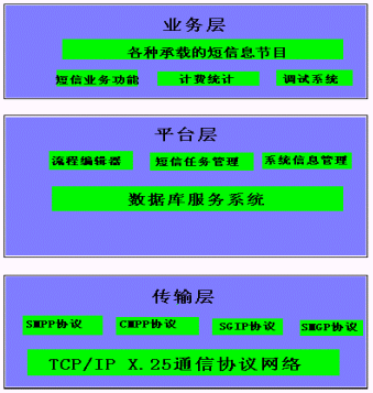 3、 傳輸層:主要完成與聯(lián)通、移動和網通等公司的網絡傳輸,本系統(tǒng)支持多種傳輸協(xié)議,SMPP協(xié)議,CMPP協(xié)議、SGIP協(xié)議和SMGP協(xié)議。