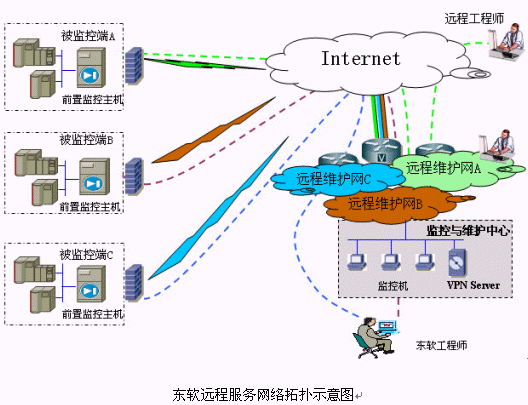 對(duì)于需要遠(yuǎn)程服務(wù)的IT系統(tǒng),只要可以連接INTERNET,就可使用合法的帳號(hào)接入遠(yuǎn)程服務(wù)平臺(tái),不需做額外的復(fù)雜設(shè)置;同樣,對(duì)于遠(yuǎn)程服務(wù)工程師,無(wú)論身在何處,只要可以連接INTERNET,便可登錄到遠(yuǎn)程服務(wù)平臺(tái),利用專業(yè)工具監(jiān)控或調(diào)試遠(yuǎn)端系統(tǒng)