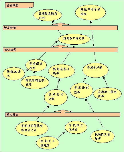 全程全網(wǎng)考核策略目標(biāo)因果關(guān)系圖是"平衡計分卡"應(yīng)用的重要環(huán)節(jié),在此要特別強調(diào)?因為它是將根據(jù)公司遠景規(guī)劃以及使命確定的四個考核維度轉(zhuǎn)化為全程全網(wǎng)考核系統(tǒng)進入實際操作階段之關(guān)鍵步驟。在平衡記分卡的設(shè)計過程中,它起著承前啟后的作用,在構(gòu)建呼叫中心全程全網(wǎng)考核系統(tǒng)中全程全網(wǎng)考核策略目標(biāo)因果關(guān)系圖的突破性銜接功能-以其邏輯性的架構(gòu)來界定和描述實現(xiàn)全面績效考核的策略方案。將公司成功、客戶價值、核心流程和呼叫中心核心能力之間的關(guān)聯(lián)清晰地呈現(xiàn),并將企業(yè)的策略與其績效衡量系統(tǒng)相銜接。