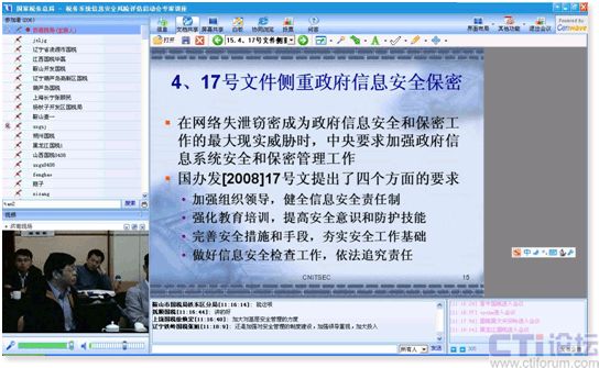 CTI論壇(ctiforum)05月07日消息: 4月8日-9日國家稅務(wù)總局組織全國省國稅地稅局IT主任與解放軍總參三院、中國信息安全評測中心、神州網(wǎng)御70多人在濟(jì)南錦繡山莊以及全國各地國稅地稅相關(guān)人員200多人使用自己辦公室的電腦通過盛維(Cenwave)新世紀(jì)提供的網(wǎng)絡(luò)視頻直播系統(tǒng)召開“國家稅務(wù)系統(tǒng)信息安全風(fēng)險(xiǎn)評估啟動(dòng)會”。此次會議是國家稅務(wù)總局首次租用網(wǎng)絡(luò)視頻會議直播系統(tǒng)召開全國性會議也是參會人數(shù)最多的一次,不僅打破地點(diǎn)人數(shù)的限制、克服了硬件設(shè)備的局限、節(jié)省行政成本,也是建設(shè)“兩型社會”的具體體現(xiàn)。