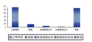 在國內(nèi),視訊市場的形成已經(jīng)初露端倪,眾多商家都開始瞄準(zhǔn)這個新的利潤增長點。2002年8月,上海電信正式將視訊業(yè)務(wù)命名為“新視通”,并陸續(xù)開通了上海至美國洛杉磯、新疆烏魯木齊、石河子、克拉瑪依等地區(qū)的公眾視訊業(yè)務(wù),同時還針對商用客戶和個人用戶啟動了推廣計劃。由于上海是我國的貿(mào)易、金融、經(jīng)濟(jì)中心,許多國內(nèi)外的大型企業(yè)都在上海設(shè)有分支機(jī)構(gòu),市場潛力不可估量,眾多運(yùn)營商都在爭取上海的市場。目前,除了上海電信推出的“新視通”業(yè)務(wù)外,網(wǎng)通、有線網(wǎng)絡(luò)和其它公司都在上海推出了自己的視訊系統(tǒng)。根據(jù)我們對企業(yè)用戶的抽樣調(diào)查,下圖的市場占有率表明了視訊業(yè)務(wù)的競爭將會日益激烈。
