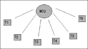 就H.323來講,企業(yè)存在ADSL、電信專線、衛(wèi)星網絡等多種選擇。H.323基于IP網絡,IP網絡雖然是總線型的網絡,但從H.323視頻會議系統(tǒng)組網來說,依舊同H.320視頻會議系統(tǒng)一樣,是星型網絡,如圖所示,所有的終端數(shù)據都匯集到MCU處。這樣對視頻會議系統(tǒng)組網就提出了要求,如果MCU以下共有6個終端,每個中端以B的帶寬開會,那么各個終端處的帶寬要求為B,MCU處的帶寬要求就為6B。