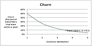 部署智能管道可以在網(wǎng)絡(luò)容量和業(yè)務(wù)保障方面產(chǎn)生積極影響。針對(duì)高端用戶提供免溢價(jià)的高價(jià)值服務(wù)/業(yè)務(wù),會(huì)提高高端用戶群體的滿意度。高端用戶是高額利潤的保障,是所有運(yùn)營商爭(zhēng)取的目標(biāo),而用戶滿意度是決定他們是否留在網(wǎng)絡(luò)的最重要因素。應(yīng)用智能管道后,預(yù)期年離網(wǎng)率將下降1%~2%。離網(wǎng)率的降低,將使用戶平均停留在本網(wǎng)絡(luò)的周期加長,從而增加收入并減少新用戶的獲取成本。這一部分的價(jià)值和意義,將大于資源合理分配和差異化業(yè)務(wù)的價(jià)值。下面的圖表顯示了離網(wǎng)率和用戶滿意度的關(guān)系。